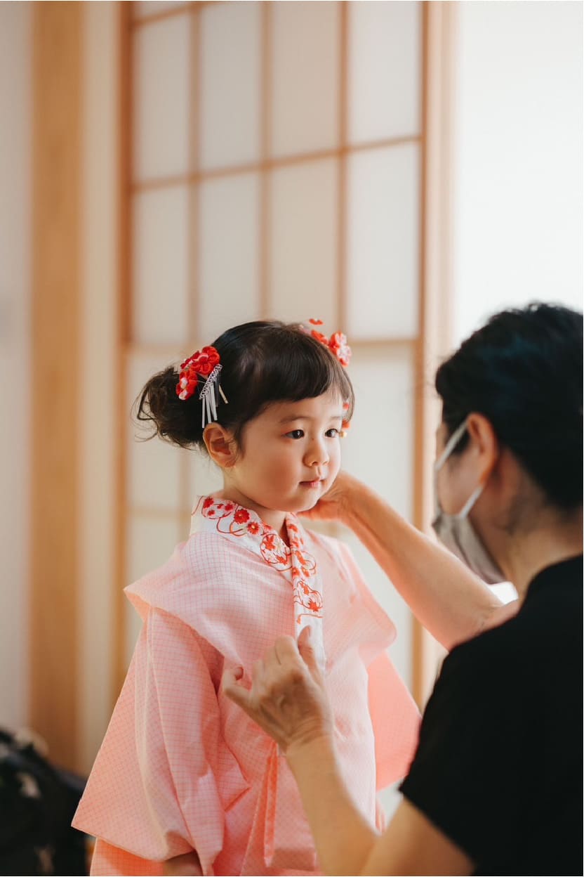 娘の着付けは嫌がったりしないかと心配しましたが、成瀬さんのお人柄と手際の良さで落ち着いて着ることができほっとしました。娘も着物を気に入ってくれたようで、1日着物で過ごしてくれました。今でも着物の話をすると「今すぐ着たい!」というほどです。また次の機会にもぜひお願いしたいと思っています。本当にありがとうございました。(K.T 様)