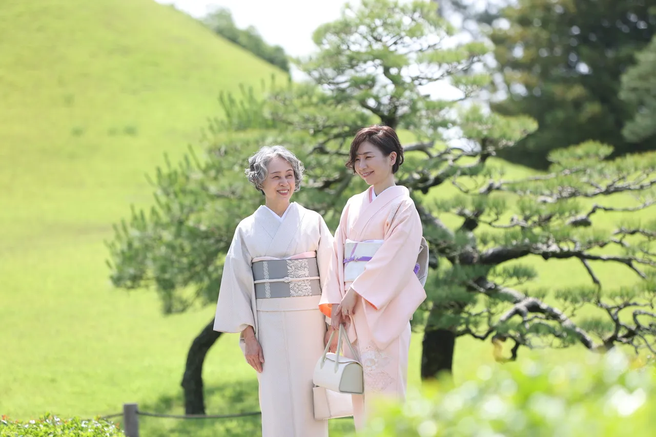 今回、母が50年前に購入した思い出の着物を着付けしていただき、友人と成趣園を散策しました。着物を着てみたい気持ちはあったものの、着付けは難しいし、何だか特別な物のような気がして敷居高く感じていましたが、事前の打ち合わせではパーソナルカラー診断もしていただけて、着付師の成瀬さんの確かな技術と工夫とコーディネート力で素敵に着せて頂きました。この体験を通して身近にあった古き良き物の価値や素晴らしさを改めて味わう体験ができましたし、この機会をきっかけに母と着物にまつわる話をしながら譲り受けられたのも私にとってうれしい時間になりました。着物を身近に感じられ、着物を着るという選択肢ができたことで楽しみが増えました。(水上里美 様)